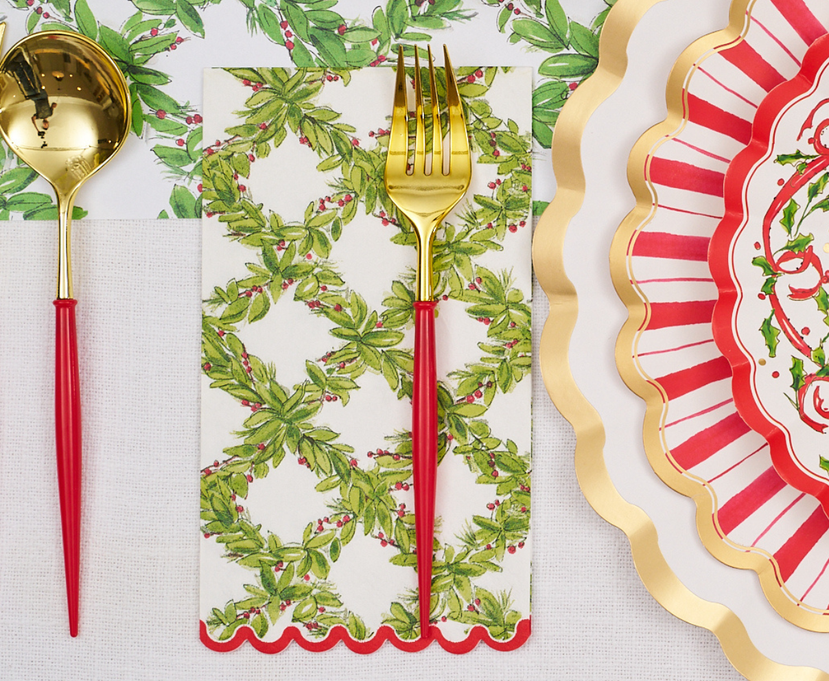 These guest towel napkins from our Holly Berry collection feature a festive trellis of lush Christmas greenery and bright holly berries. Finished with an adorable scalloped red edge, they add the perfect touch of charm to your holiday celebrations. Whether used as a stylish dinner napkin or as an elegant guest towel for your bathroom or powder room, they'll bring a touch of beauty to any occasion!